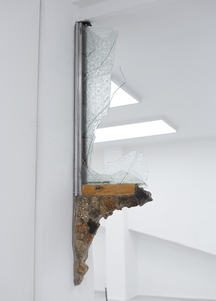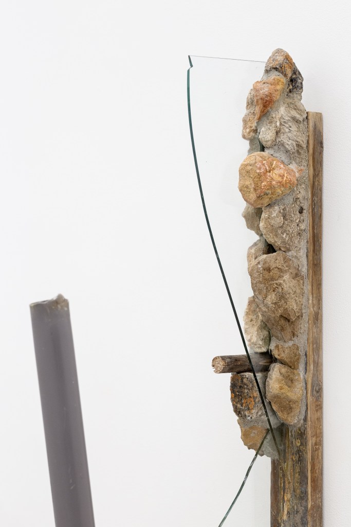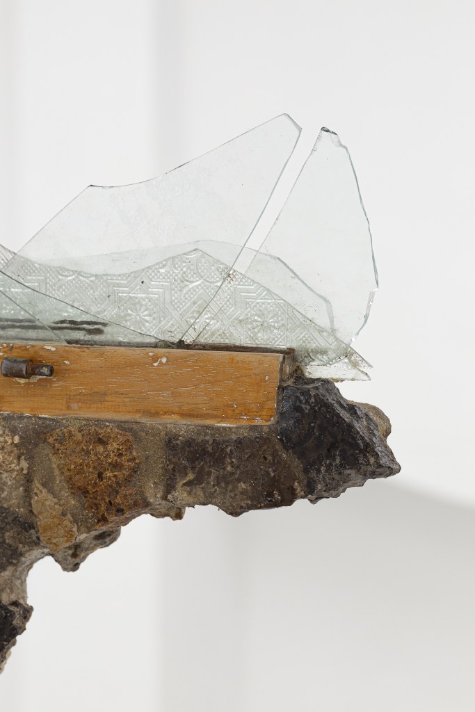«Les éclats de verre que l’on retrouve dans le travail de Laurane Gourdon-Fahrni, parmi d’autres matériaux liés à des restes architecturaux, sont des objets ayant été traversés par des flux énergétiques (air, électricité, eau).