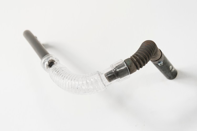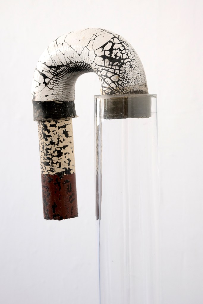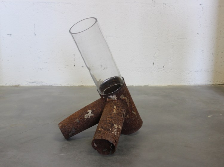 L’idée de travailler avec le verre m’a paru évidente pour son aspect transparent, fragile et délicat. Séduite par le coté transparent et précieux de la matière qui pouvait contraster avec mes récupérations, j’ai choisi de jouer sur un rapport à la réalité, en liant des tubes récupérés invisibles, transparents sous nos yeux, jetés, abandonnés, qui ont perdu leur fonctions initiales, avec ces «précieux» tubes fabriqués en verre soufflé.