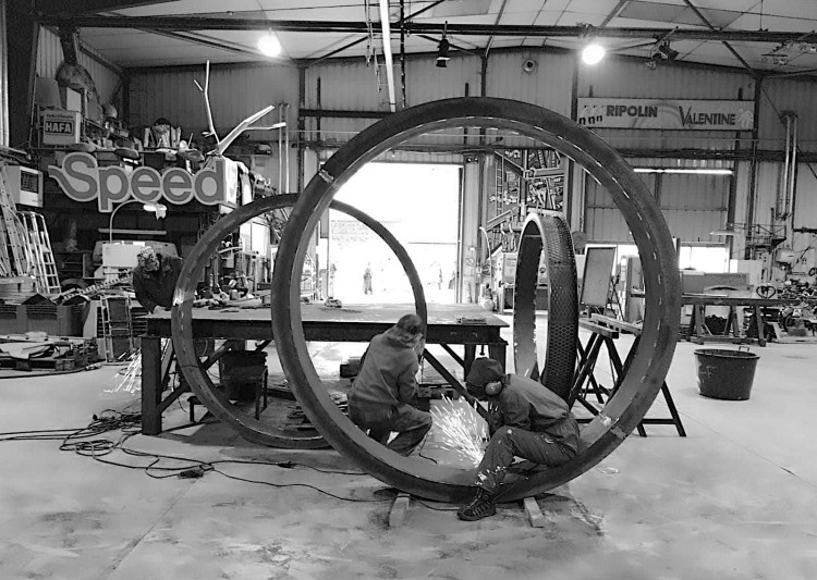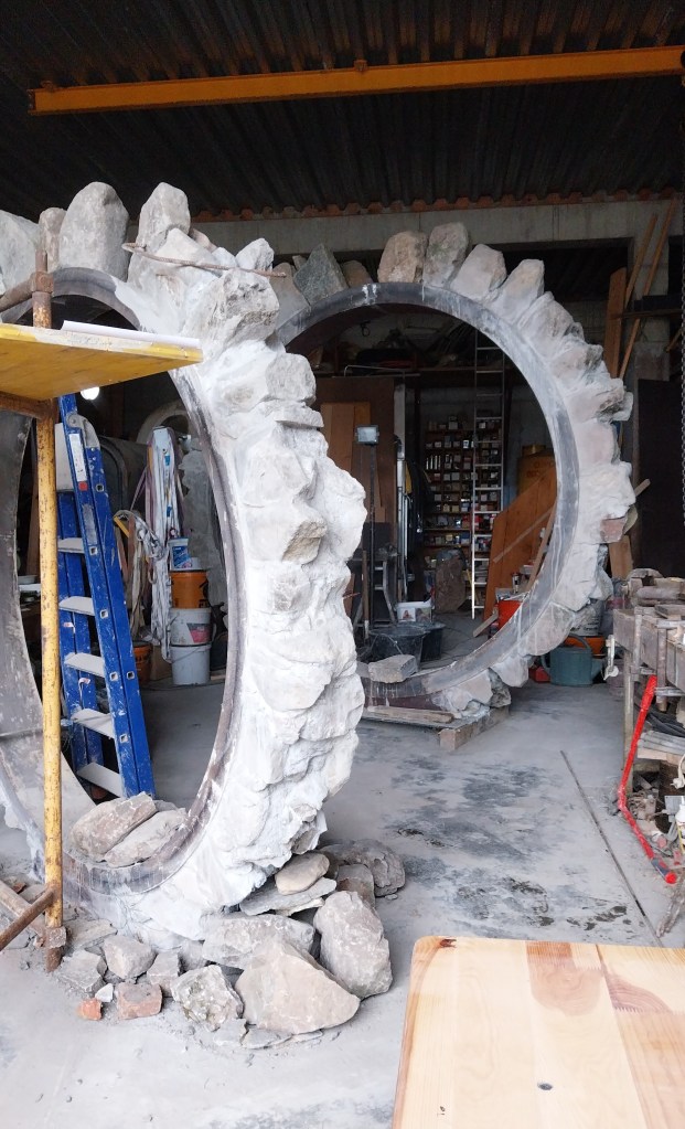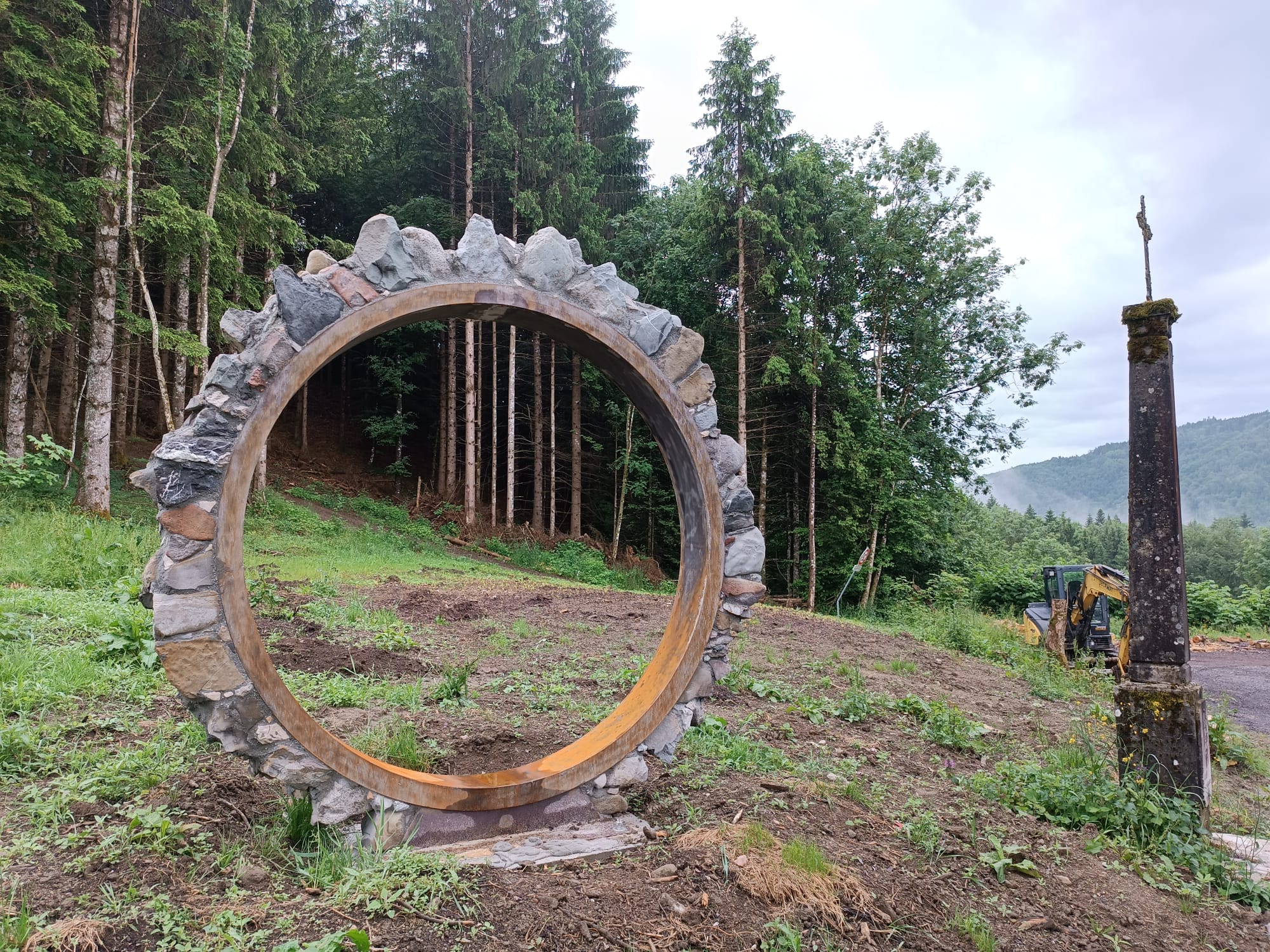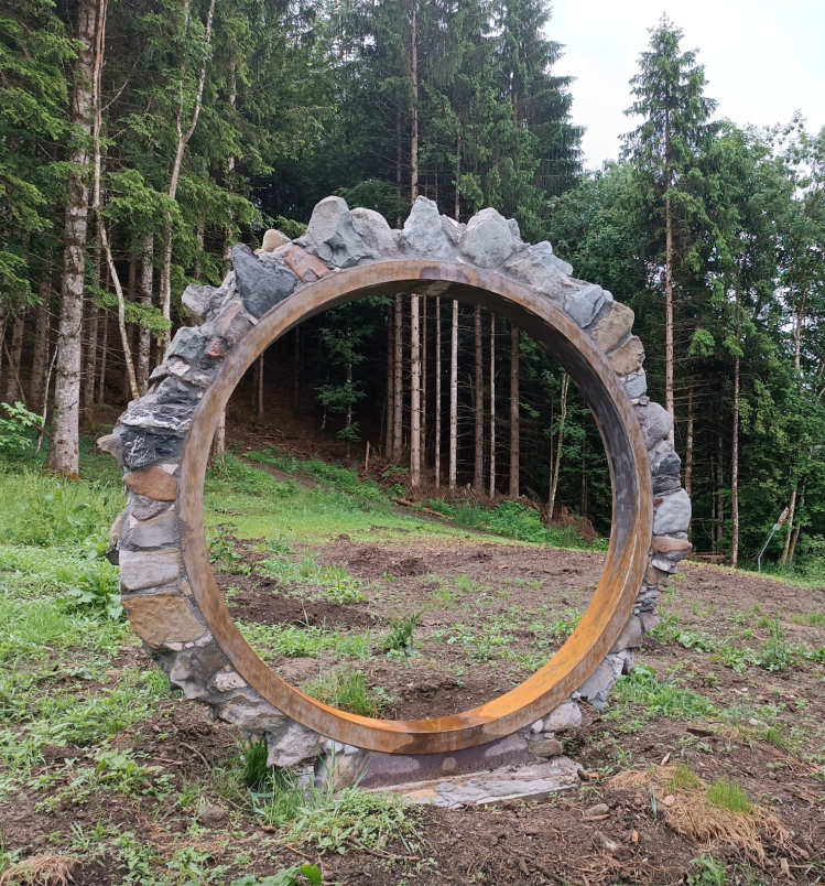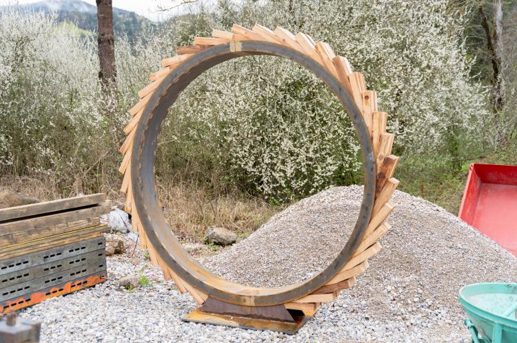 Le projet a été porté avec le soutien de l’agence de production artistique Millecent, qui m’a accompagnée dans sa mise en œuvre. Il a pris forme grâce à une collaboration précieuse avec Les Ateliers Sud Side pour la conception des cercles en métal, ainsi que de l’entreprise Maçonnerie-Degenève et EG.Menuiserie pour le travail de la pierre et du bois local.